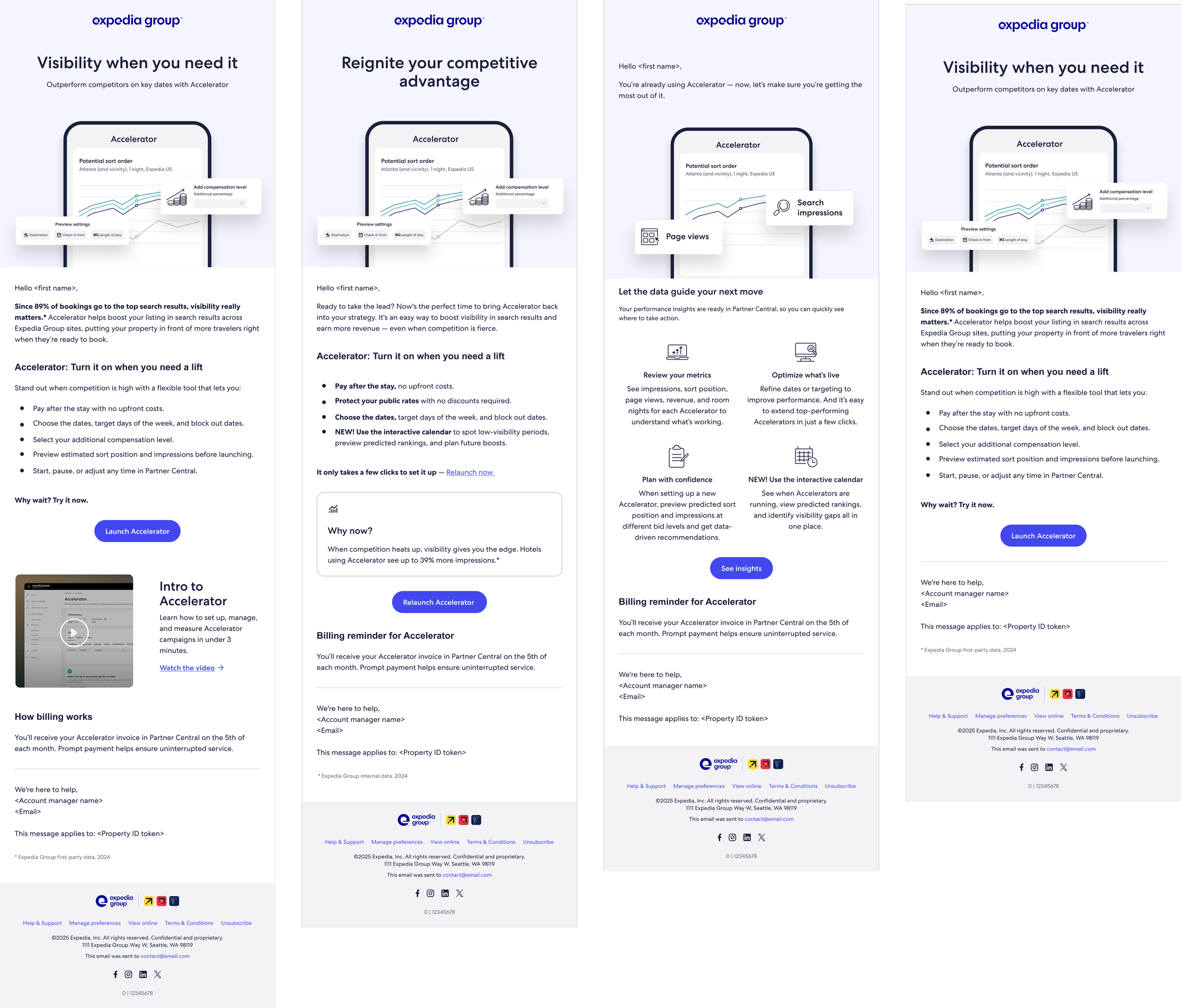 For the Accelerator marketing campaign, I created a series of targeted partner emails that helped introduce the tool and highlight actions hotels can take to improve visibility on Expedia Group marketplaces. The campaign focused on educating hotel partners about the factors that influence visibility on Expedia Group platforms and how Accelerator can help improve search placement and bookings.