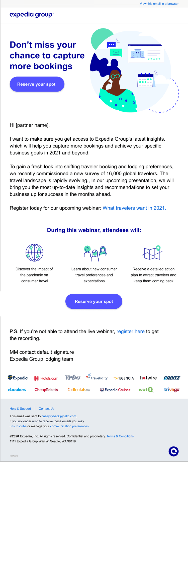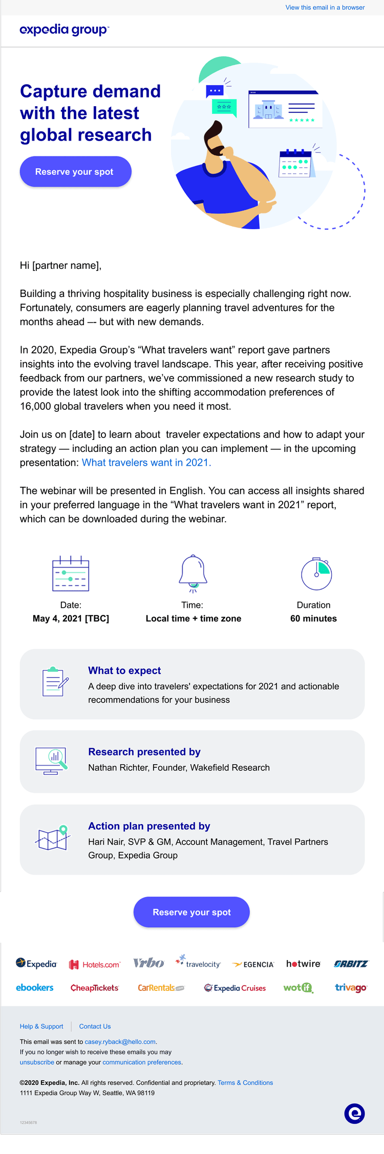 Two coordinated campaigns supported the launch. The first introduced the product, explaining what Optimized Distribution Rates is, how it works, and how partners can get started. The second campaign invited partners to join a live webinar, providing an opportunity to learn more directly from Expedia Group marketing leaders and see the product’s value in action.